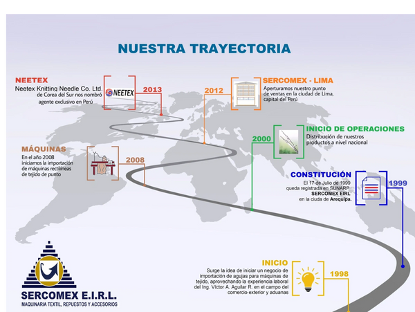 Tenemos una experiencia de más de 20 años en el campo de los repuestos para máquinas de tejer. Los fundadores de SERCOMEX EIRL siempre se han preocupado por conseguir lo que el cliente pide y que no logra conseguir con otros proveedores, es por eso que nos mantenernos como lideres por tanto tiempo en el mercado peruano.